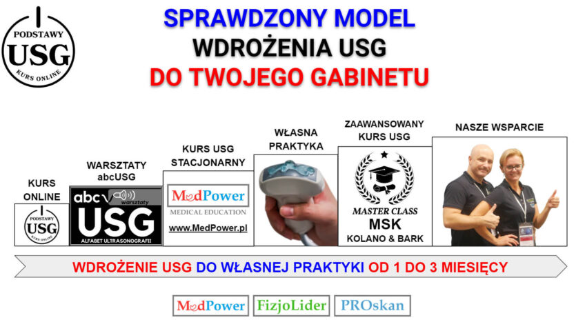 Szkolenia z USG w obszarze narządu ruchu dla fizjoterapeutów i lekarzy. Ważnym filarem naszej działalności, zaraz obok dystrybucji nowoczesnych aparatów USG, jest organizowanie szkoleń USG, które są kluczowym elementem procesu zakupu urządzeń. Podczas takich kursów, klienci mają szansę korzystać z wielu sprzętów, co pozwala im na zapoznanie się z ich specyfikacją techniczną oraz możliwościami praktycznymi. Tym, co wyróżnia PROskan, jest rozbudowany model edukacyjny w ultrasonografii dla fizjoterapeutów, którzy nie mieli jeszcze zajęć z diagnostyki obrazowej. By profesjonalnie świadczyć usługi szkoleniowe założyliśmy szkołę ultrasonografii - FizjoLider oraz MedPower – serwis kursów medycznych. Dodatkowo nasze kursy NAGRYWAMY LIVE, co pozwala na skuteczne utrwalanie zdobytej wiedzy i praktyki po kursach USG.